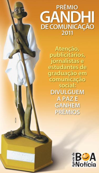 Vem aí o Prêmio Gandhi de Comunicação 2011, iniciativa da Agência da Boa Notícia para estimular a Cultura de Paz através da Comunicação. As inscrições começam nesta quinta-feira (25) e continuam até 13 de maio de 2011. O Prêmio aumentou em valor e categorias. Serão R$ 35 mil distribuídos entre nove categorias. O objetivo é reconhecer o trabalho de profissionais e estudantes de Jornalismo e Publicidade & Propaganda que divulgam a paz. A festa de entrega acontece em junho de 2011.